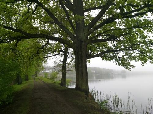 Tego kolosa nazwałam Dąb Bobrowy, bo rośnie nad rozlewiskiem, które utworzyły bobry - budowniczy wodnych tam. To taki trochę samotny, poważny, elegancki pan. Inne, mniejsze dęby rosną jakby nieśmiało, w lekkim oddaleniu. On zaś tę przestrzeń, która go otacza wypełnia znakomicie swym majestatem, wielkością i szlachetnością. Powykręcane grube konary zagarniają powietrze nie przejmując się sąsiedztwem. Ze swej wysokości pilnuje niejako wschodniego brzegu stawu. Ma ze swej prawej strony, patrząc z grobli, widok na ogromne przestrzenie łąk, na których pasą się niekiedy konie, w nocy odważnie buszują leśne zwierzęta. Czuwa nad ich spokojem, nad porządkiem tego brzegu, nad równowagą miedzy wodą, a suchym lądem. Dalej kanał, a nad nim kolejne dęby, ale te, choć równie wielkie, równie stare i równie piękne, nie należą już do grobli. Jest więc Pan Bobrowy swoistym łącznikiem nad śluzą, przez którą woda z kanału przepływa do stawu, zasilając go. Pan Bobrowy. Jesteś ważny. Pilnujesz zasobności w wodę. A woda to życie. Jakże więc nie szanować kogoś, kto sprawuje pieczę nad zasilaniem stawu w wodę?